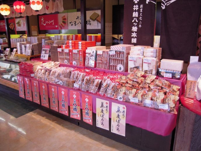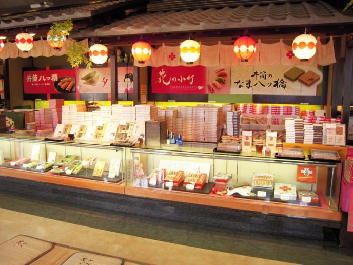 이즈쓰 야쓰하시 본점은 인기 기념선물 과자를 갖추고 있습니다.