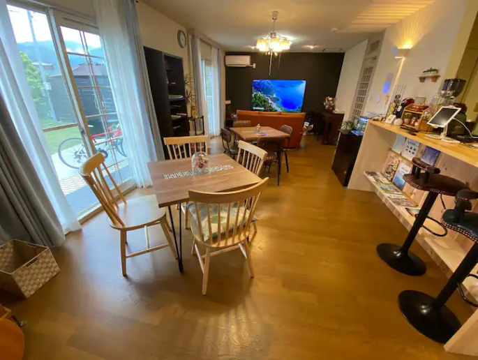 해외 관광객 및 국제교류에 관심이 있는 분들을 위한 숙박시설로 자연이 풍요로운 시가현 다카시마시에 있습니다. 벽난로를 갖춘 넓고 조용한 방에서 휴식을 취하실 수 있습니다. ‘일본의 물가 100선’에 선정된 ‘하기노하마 해변’까지 걸어서 2분이면 도착합니다. 여름에는 바로 옆에 있는 비와코 호수에서 해양스포츠(SUP, 카약, 윈드서핑)를, 겨울에는 스키를 즐길 수 있습니다(자동차로 약 30분). 지역 주민들과 교류할 수 있는 이벤트도 개최됩니다.