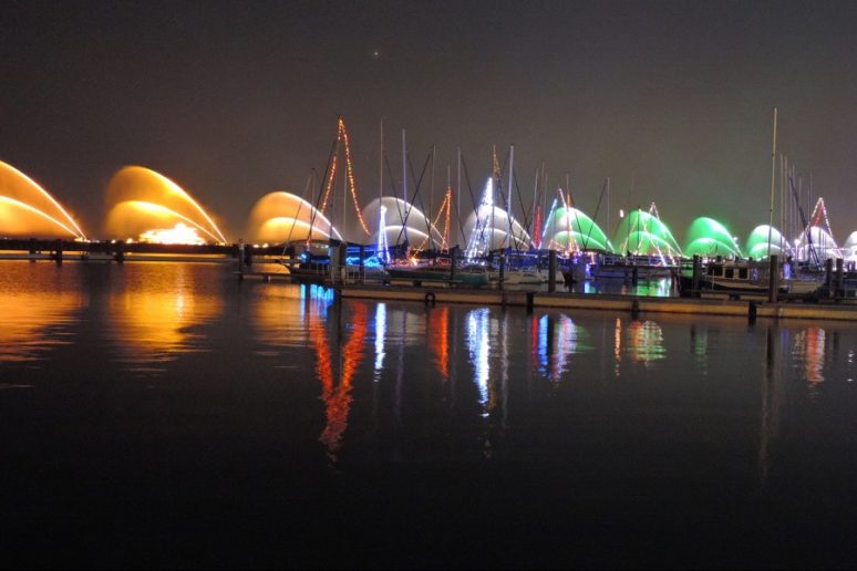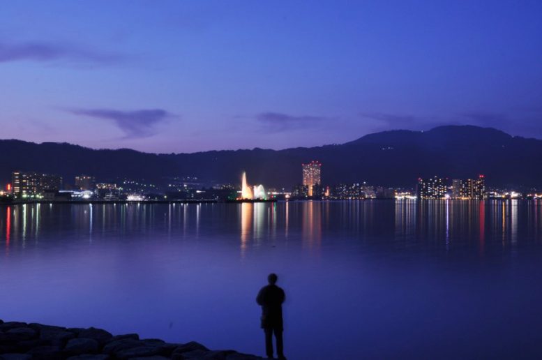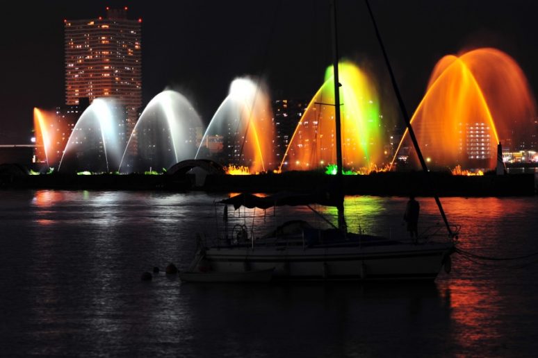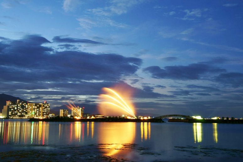 The Lake Biwa Flower Fountain is a large fountain located on a 180m breakwater in the Otsu Port offing, that sends out streams of 440m long water 40m high into the air (the equivalent of a 10 storey building).
