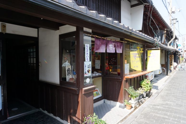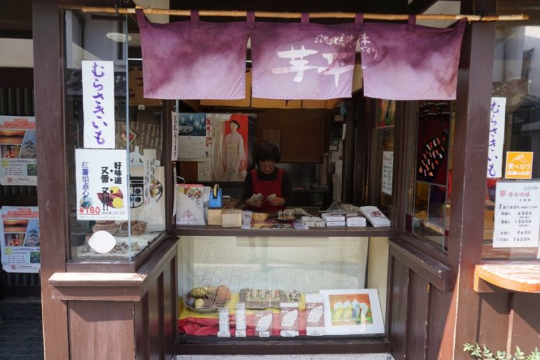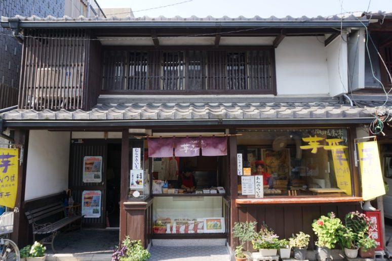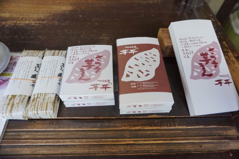 芋平金锷饼在3种红薯馅上蘸糯米粉等佐料,逐一用锅精心烤制而成。店内可观看制作过程,汇聚了来长浜观光的四方游客。