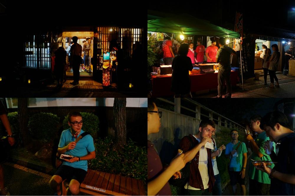 Walking around the town at night was a lot of fun; there were many vendors selling food (like omi beef skewers, takoyaki, corn on the cob, and more), people singing, and lots of hustle and bustle.